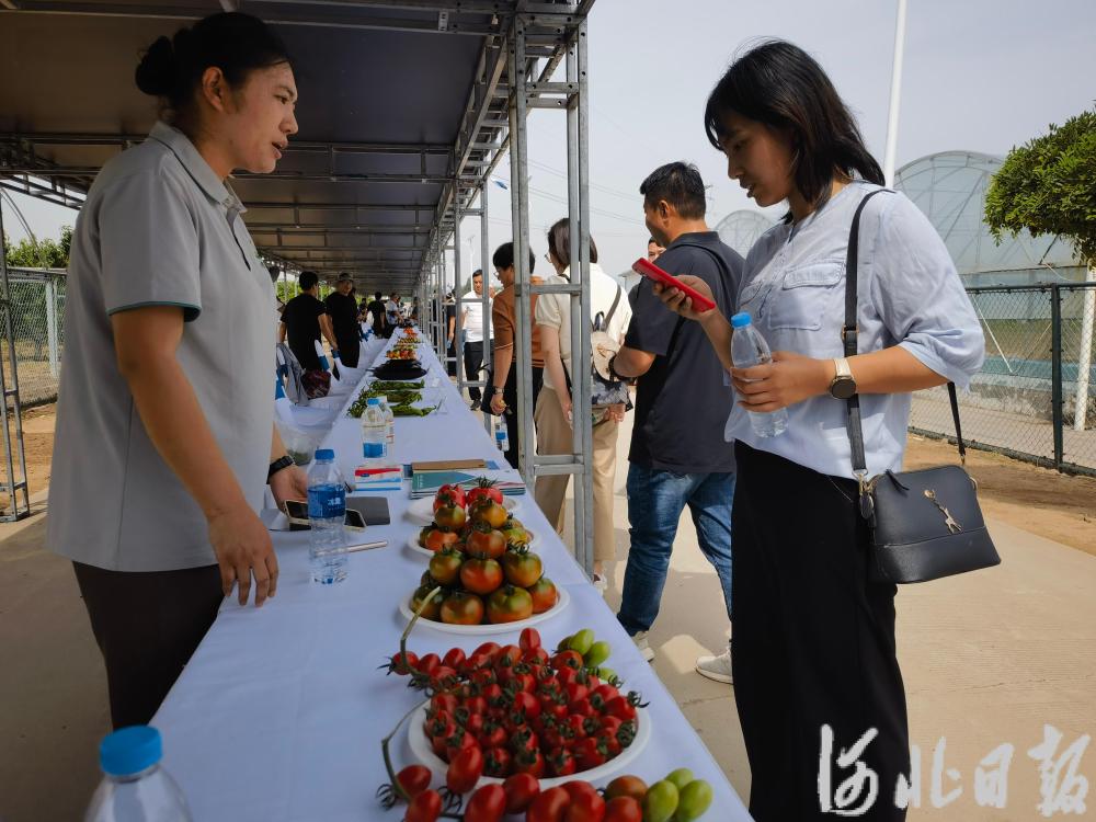6月8日,在2024年第五届中国·北方农业(蔬菜)科技创新发展大会上,参会人员实地了解示范展示的蔬菜新品种。通讯员李红雨摄