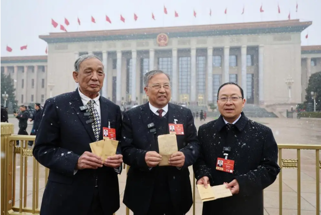 3月4日,十四届全国人大四次会议举行预备会议,郭进考(左)、茹振钢(中)、杨武云(右)三位代表在会议前交换种子。赵海江摄(河北日报供图)