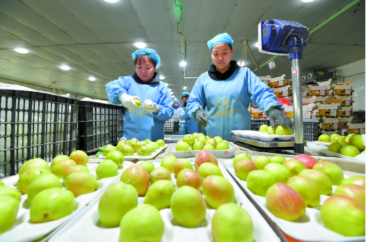 在晋州市马于镇的河北长城果品股份有限公司果品加工车间,工人进行梨果分拣作业。 记者 张晓峰 摄