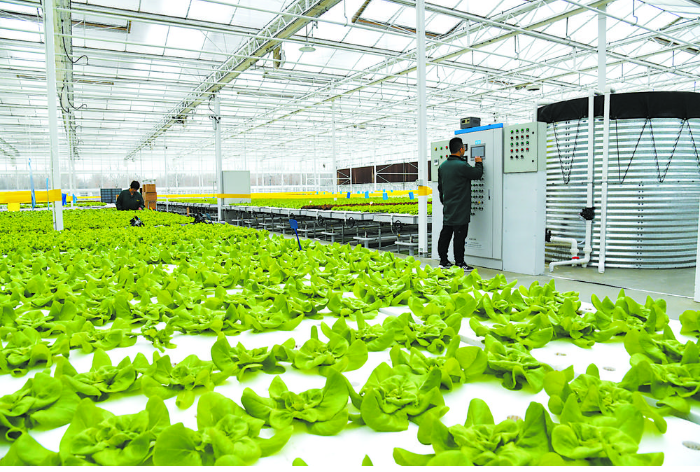 3月24日,在位于石家庄市鹿泉区的新兴际华(河北)农艺生态有限公司智能玻璃温室,工作人员正在对水培蔬菜进行管理。该智慧农业设施采用先进的中央环控系统,实现了对温室内温、光、水、气、肥等要素的全智能化控制调节,为乡村振兴注入了新活力。 记者 张 震 摄