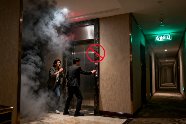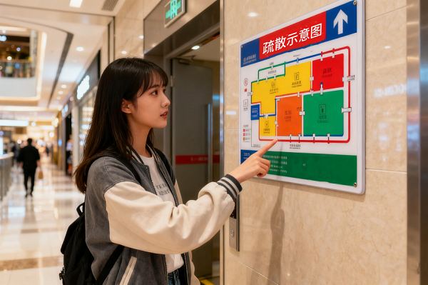外出购物、聚餐、娱乐、住宿时,要留意场所疏散通道、安全出口的位置,了解灭火器、防烟面罩等自救逃生器材的存放位置并掌握使用方法。