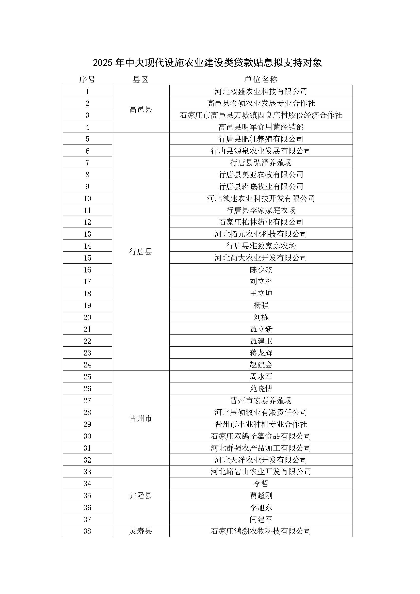 按照《石家庄市2025中央现代设施农业建设类贷款贴息补助项目工作方案》要求,2025年中央现代设施农业建设类贷款贴息补助项目经新型农业经营主体自主申报、县级遴选、市级复核,确定105家经营主体为支持对象(具体名单详见下表)。现予以公示,公示时间为2025年11月18日至11月25日。