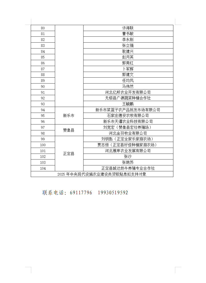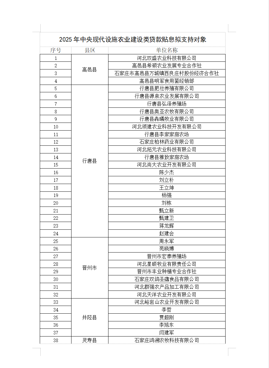 按照《石家庄市2025中央现代设施农业建设类贷款贴息补助项目工作方案》要求,2025年中央现代设施农业建设类贷款贴息补助项目经新型农业经营主体自主申报、县级遴选、市级复核,确定104家经营主体为支持对象(具体名单详见下表)。现予以公示,公示时间为2025年11月18日至11月25日。