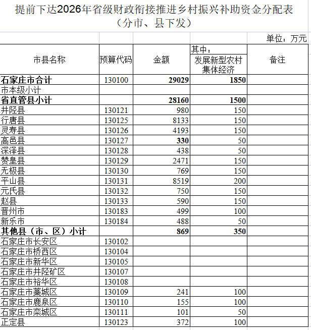 关于提前下达2026年省级财政衔接推进乡村振兴补助资金预算的通知